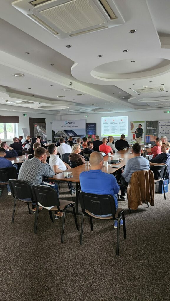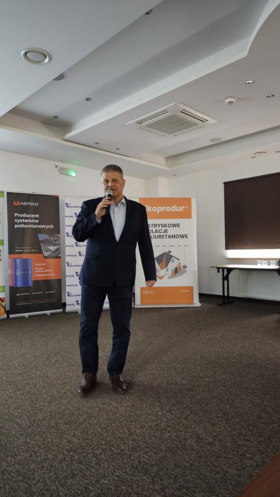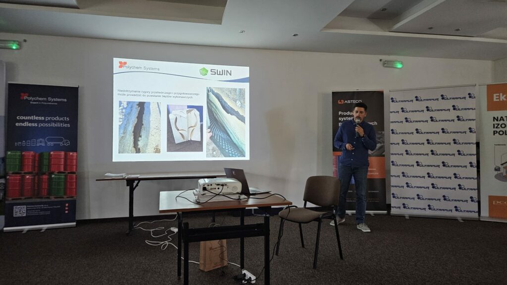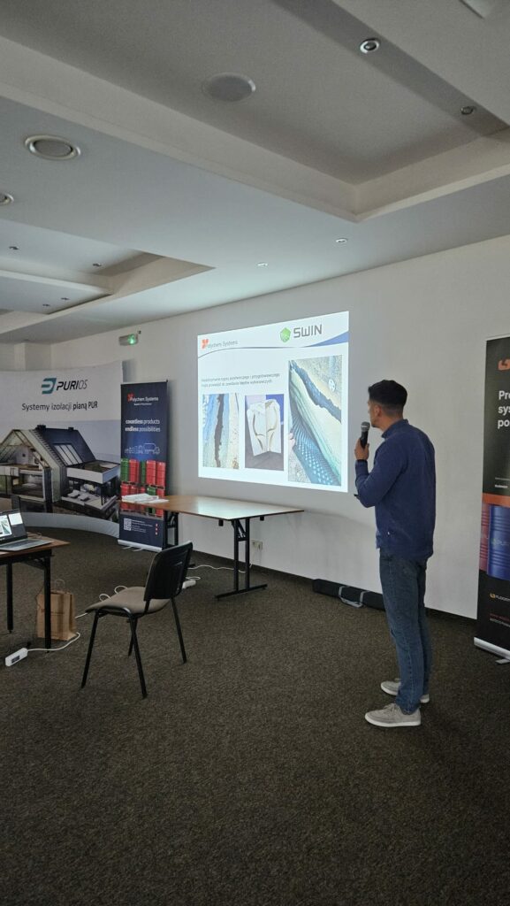 W dalszej części spotkania Piotr Kasiura z PCC Prodex omówił kwestię zagrożeń związanych z natryskiem pian poliuretanowych na membrany wstępnego krycia. Szczególną uwagę zwrócił na zjawisko „wypychania” membrany, zależne od techniki wykonania natrysku. Materiały filmowe i zdjęcia zaprezentowane podczas wykładu wywołały ożywioną dyskusję, co tylko potwierdza, jak ważne jest prawidłowe wykonawstwo oraz świadomość ryzyk technologicznych.