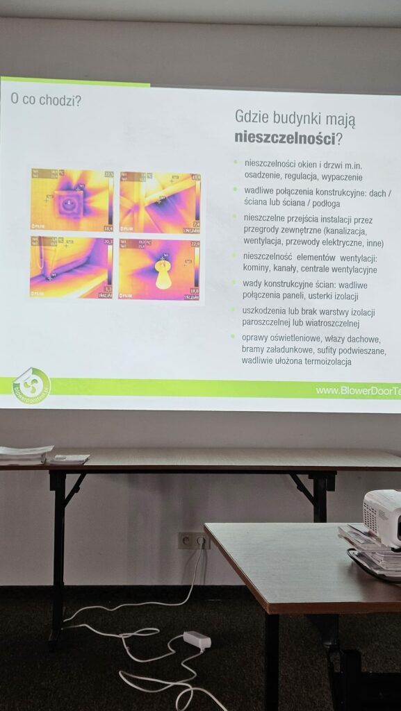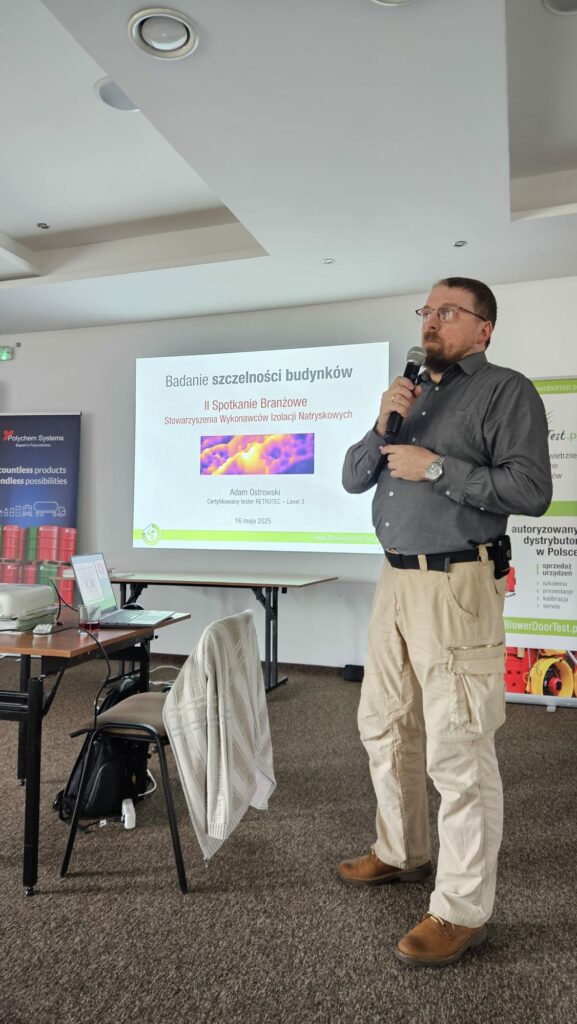 Następnym punktem programu było wystąpienie Adama Ostrowskiego z firmy Progress Energy, doświadczonego specjalisty w zakresie badań szczelności budynków. Prelegent przedstawił konsekwencje wynikające z nieszczelności przegród oraz odniósł się do aktualnych wymagań Warunków Technicznych. Zaprezentował również technologie pomiarowe i najczęściej spotykane błędy wykonawcze.